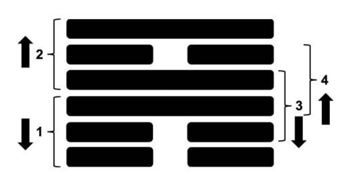 Der Ratschlag für den Umgang mit Konflikten, wie die Pfeile andeuten, lautete, dass innerhalb des Konflikts (Trigramme 1 + 2 mit Pfeilen, die in entgegengesetzte Richtungen zeigen) die Lösung des Konflikts liegt (Trigramme 3 + 4 mit Pfeilen, die sich annähern).